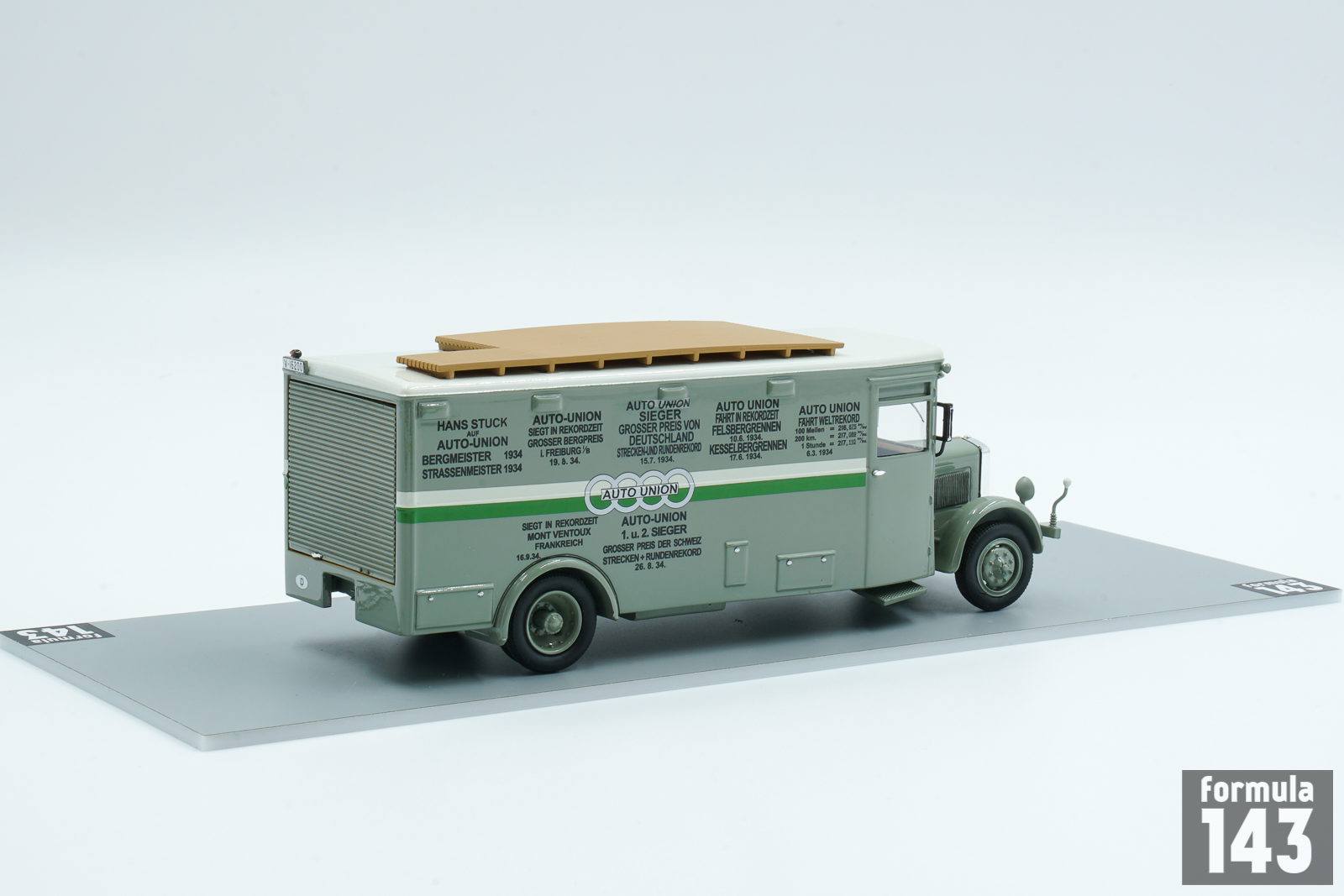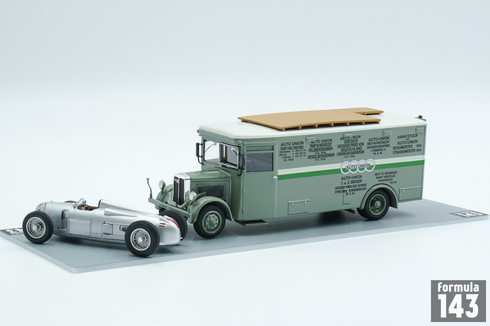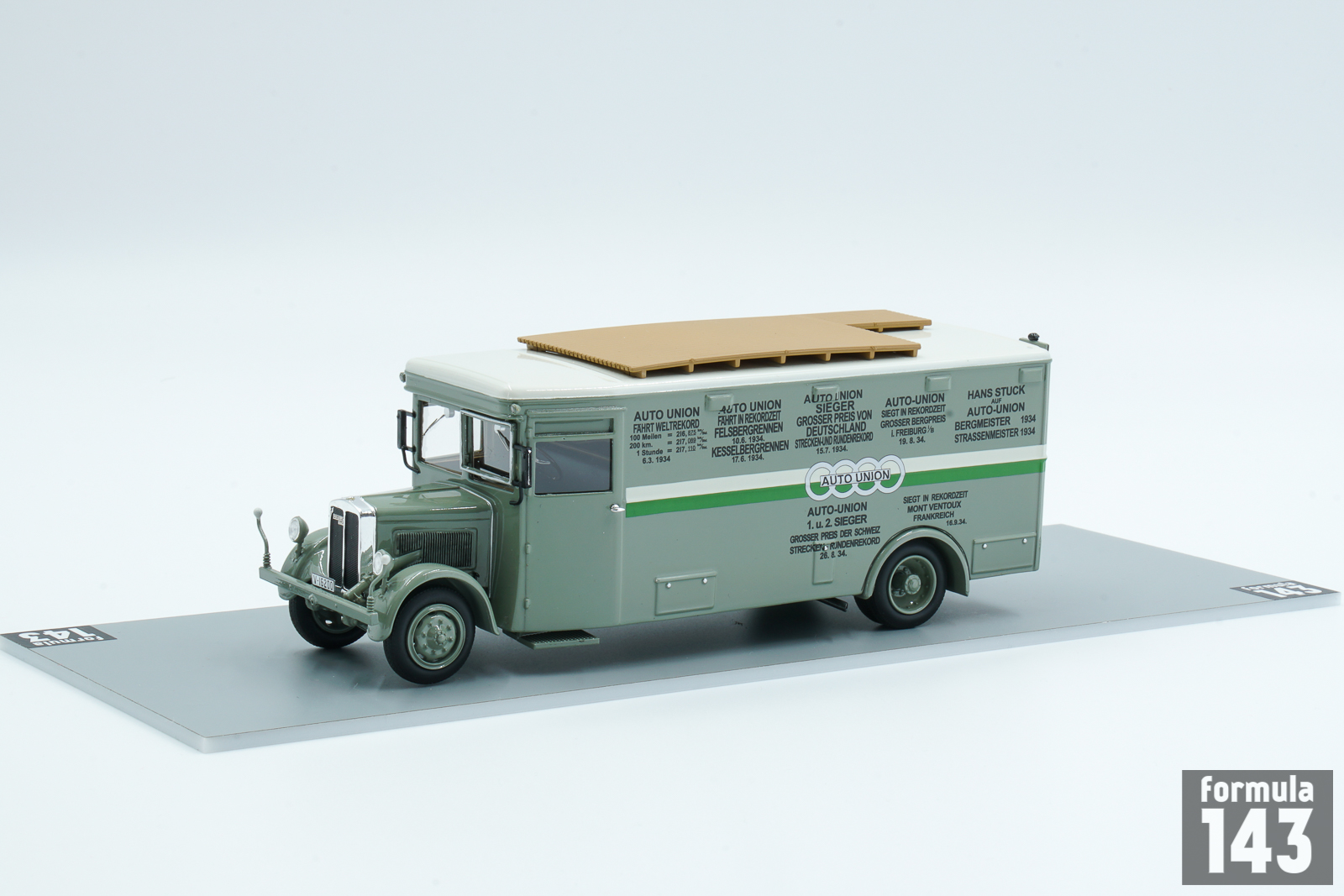 German company Büssing was founded in the year 1903 by Heinrich Büssing in Braunschweig. Büssing is considered as the oldest German lorry manufacturer. In 1931, Büssing took over the AEG (Allgemeine Elektricitäts-Gesellschaft AG) daughter NAG (Neue Automobil Gesellschaft) and become Büssing-NAG. Auto Union bought three Typ 300 lorry chassis from Büssing-NAG and delivered them to Wagenfabrik Hermann Schumann where the chassis received a box compartment over the bed, integrated with the cabin. The transporter was powered by 6 cylinder petrol unit with 3962 cm³ capable of 70 hp. With a maximum payload of 3210 kg the truck had a range of 480 km on a full fuel tank. The Auto Union transporter only had room for one race car and spares. Consequently, the Renndienst always dispatched two or three Typ 300 to each race. The Typ 300 carried all of Auto Union’s silver arrows from 1934 to 1939. Currently one surviving Typ 300 transporter is on display at the August Horch Museum, in Zwickau, Germany.
