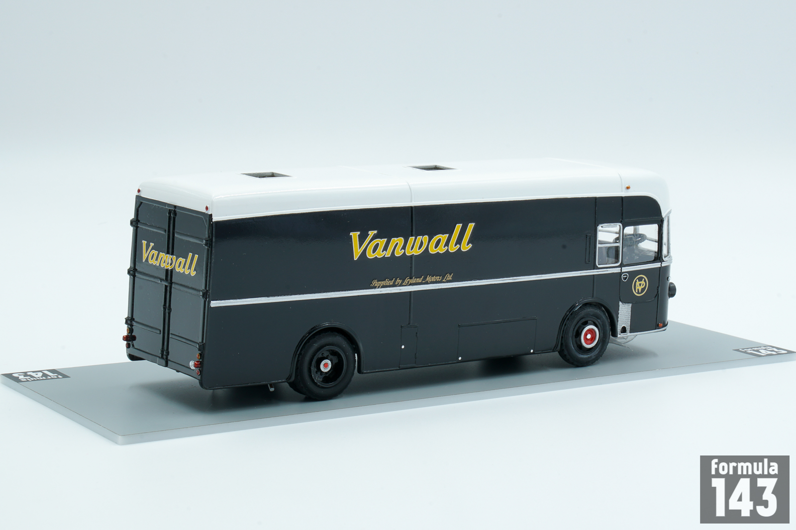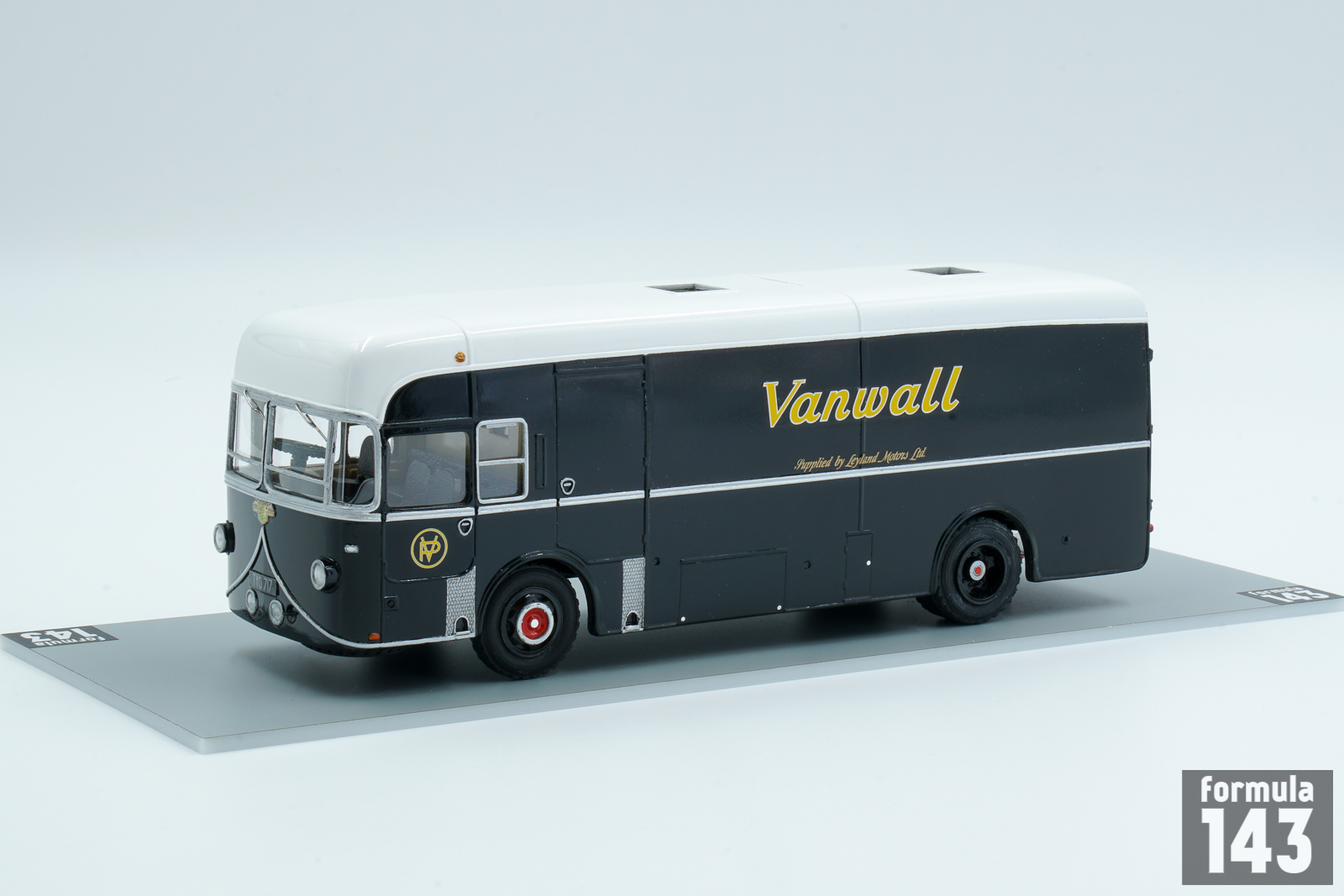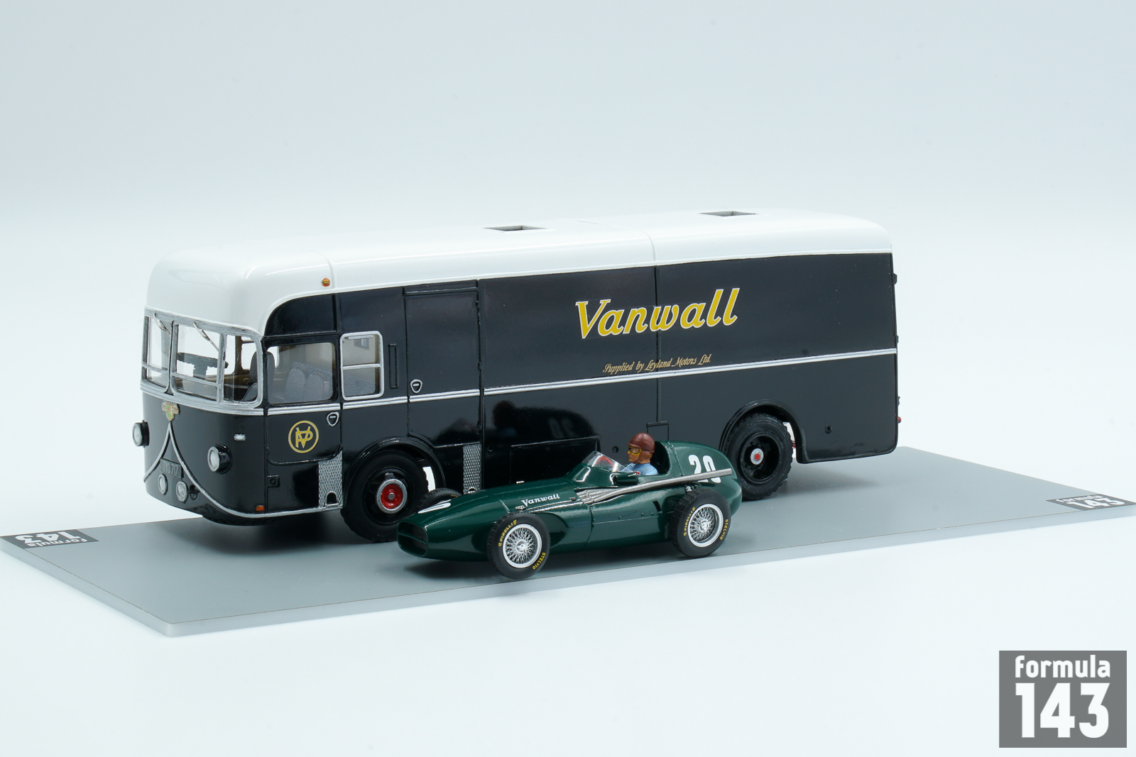 In 1957 Vanwall team received a special transporter based on a Leyland Worldmaster chassis. In the same year Vanwall became the first British manufacturer ever to win the British Grand Prix, at Aintree in 1957 with drivers Stirling Moss and Tony Brooks. Leyland Royal Tiger Worldmaster was a mid-underfloor-engined single-decker bus or single-decker coach chassis manufactured by Leyland between 1954 and 1979. In the February 1959 issue of ‘Motor Racing’ magazine, Vanwall team mechanic Derek Wootton wrote: “…The Vanwall Organisation has two of the most versatile transporters in the racing world. One is a Leyland Royal Tiger chassis with a special body, the approximate price being in the region of $4,300, less the interior workshop fittings … Ferrari and Maserati carry their cars in open-type Fiat transporters which, although good, expose them to extra dust and rain…the cars must suffer on occasion. Our vans carry two cars each – it is not our policy to put all our eggs in one basket. Our transporters are large, because we carry a very extensive range of spares and equipment. The Leyland, when loaded, weighs about 11 tons and measures 30 feet by 8 feet”. The handbuilt scale model was produced by St. Petersburg Tram Collection in Russia.
