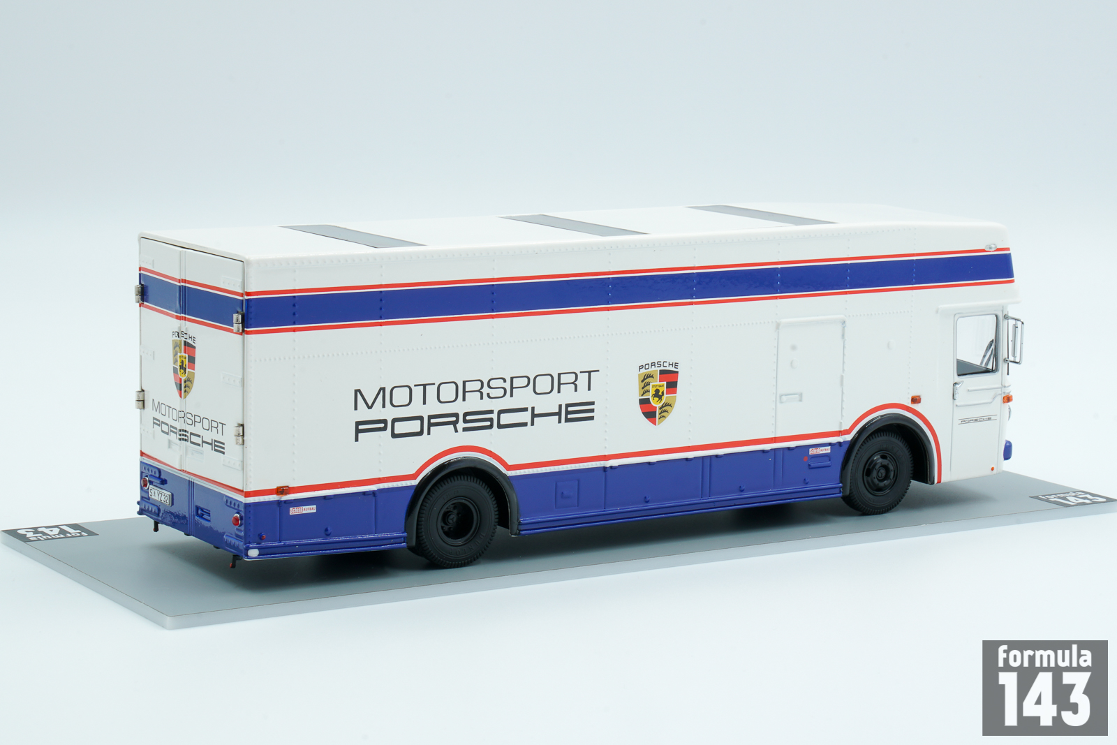The O317 is a high-floor bus model from Mercedes-Benz that Daimler-Benz AG manufactured from 1957 to 1972 and as a chassis until 1976. Mercedes-Benz O317 transporters were commissioned by Porsche in late 1966. The three rolling chassis were sent to Stuttgart-based coachbuilder, Robert Schenk. Here they were equipped with everything required to move cars and spares from race to race. Whereas most O317s were used as buses, the transporters Robert Schenk built for Porsche had additional overhead storage to enable double stacking of low slung racers. The first O317 was delivered in 1967. Registered S YZ 32 it spent the 1967, 1968 and 1969 seasons with Porsche before being loaned to John Wyer Automotive Engineering in England. John Wyer managed the works 917 programme for Porsche between 1970 and 1971 and, for these two seasons, S YZ 32 was repainted pale blue and orange to reflect the colours of his backer, Gulf Oil. It was then sold to BMW for 1972 and repainted the BMW Motorsport colours of white with red and blue stripes. S YZ 32 remained in this configuration until 1981 when it passed into the ownership of Helmut Marko whose privateer team campaigned a BMW M1 that season.