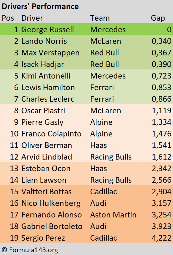 7. For Isack Hadjar, who only set a dry time in one session (where he led), the average time behind the leader during the second session, where he crashed, was assigned.