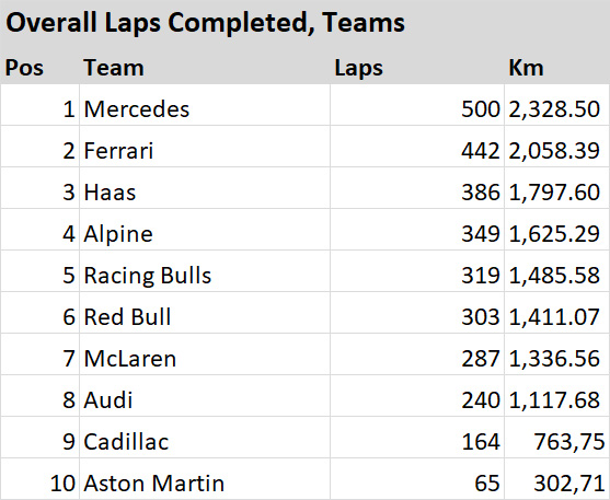 According to our data, Mercedes emerged as the leader in the shakedown. Red Bull is only slightly behind the Silver Arrows (0.2 seconds per lap). McLaren and Ferrari are less than a second behind the leader. Alpine also performed well, with a gap of just 1.5 seconds. Haas and Racing Bulls are just over 2 seconds behind. Aston Martin, Cadillac, and Audi are in the rear of the field. Moreover, the American Formula One rookie, adjusted for the number of laps completed, wasn’t the worst team.