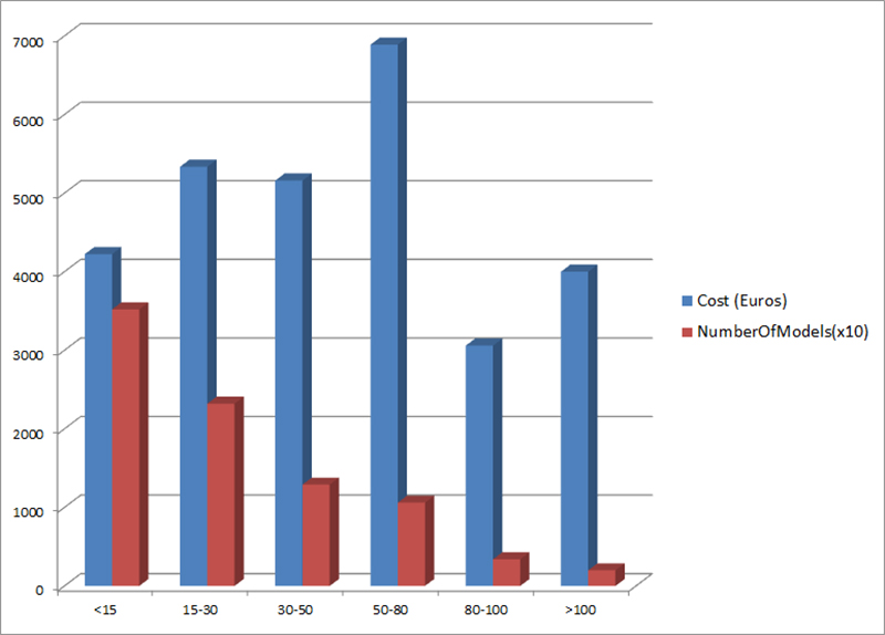 The following diagram shows the number of models of different price categories and their total cost by category using the example of the Formula143 collection. The number of models from cheaper to more expensive is gradually decreasing, but the share of the price category in the total cost does not change much. For example, the total cost of all models for more than 100 euros in my collection is almost equal to the total cost of all models up to 15 Euros. And the most resource-intensive price category of models is a segment from 50 to 80 Euros. The average price of a model in the Formula143 collection is about 40 euros, and the median price is about 50 Euros.