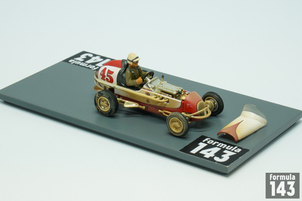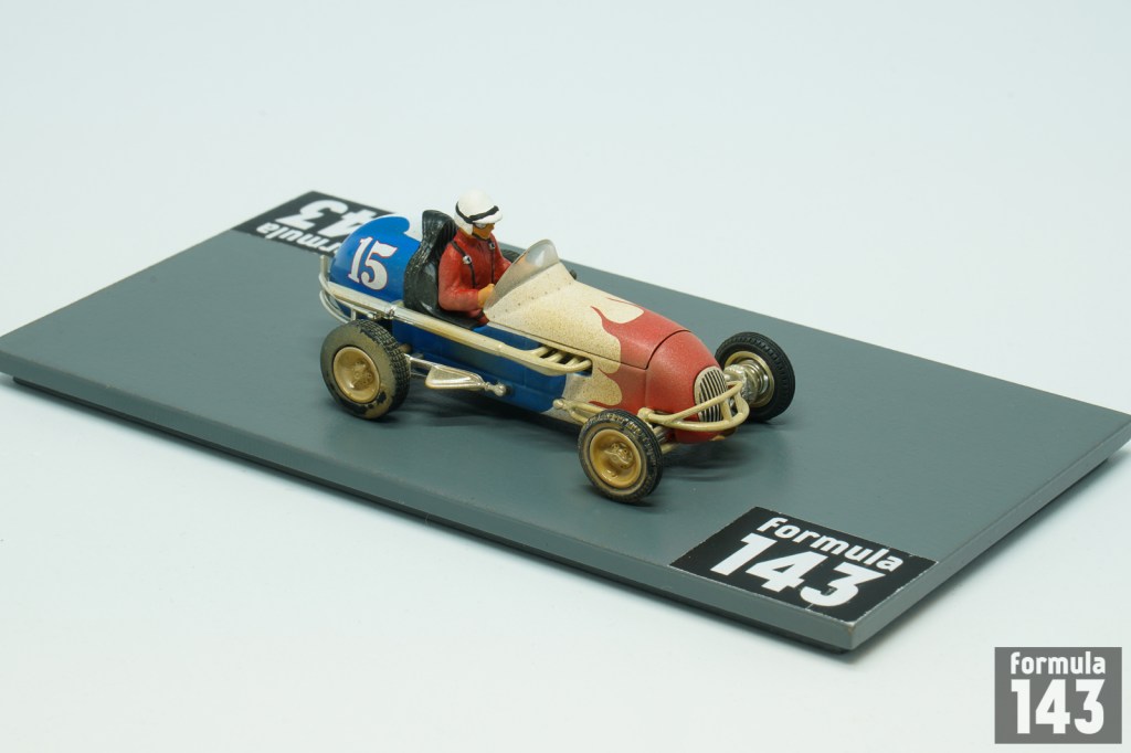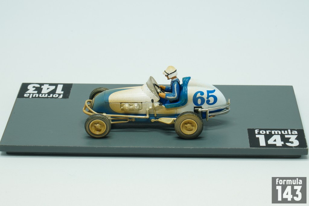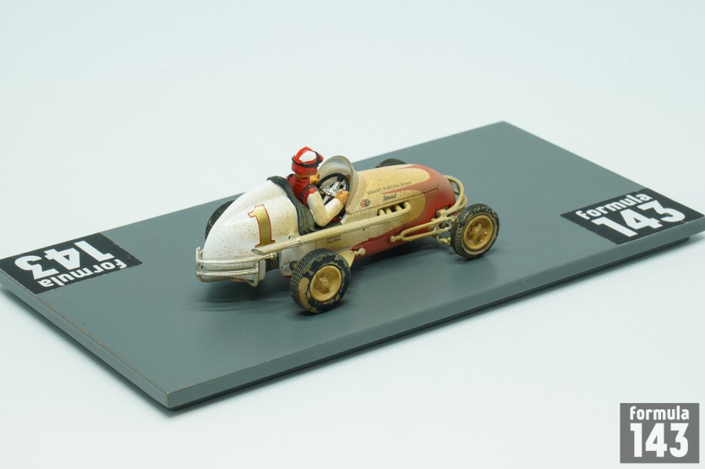 Danny Oakes was born in 1911 in Santa Barbara, California. He began racing in stock cars in 1932, switching to midgets in 1936. Oakes won first post-war Turkey Night Grand Prix at Gilmore Stadium in 1945. In 1947 he won the AAA Pacific Coast Midget Championship and twelve years later repeated the feat under the banner of USAC 1959 Pacific Coast Midget Championship. In the  1950 Turkey Night Grand Prix  in his Kurtis Kraft – Offy midget #65 entered by Fullerton Racing Team, Oaks retired in the 25-miles semifinal. However, he was 3rd at Gilmore midget race of January 1st. Oaks continued racing midgets for 25 years until the 60s. After the sanction of the National Midget Championship went from AAA to USAC in 1956, Oaks won three midget events in the USAC National Midget Championship (Detroit and Gailsburg in 1956 and Gardena in 1957).  In the 1950s Oaks tried his skills and luck in the big cars as well. He has 6 starts in the AAA National Championship in 1952-1954 with 11th at Springfield in 1954 as his best finish. Oakes failed to qualify for Indy-500 in his three attempts in 1952-54. In 1952 Oakes was entered in Indy-500 with Meyer – Offy and also he stood by as a relief driver for Alberto Ascari in Ferrari. Oaks recalled in one of his late interview in Speedsport Magazine: “I bet I drove 1,300 laps at Indianapolis, but never made the race. One year I was get $500 for being Ascari’s co-driver. I showed up, they disappeared and Ferrari still owes me 500 bucks”. Oakes usually drove in his blue and white jacket, as GMP reproduced it in the scale model.