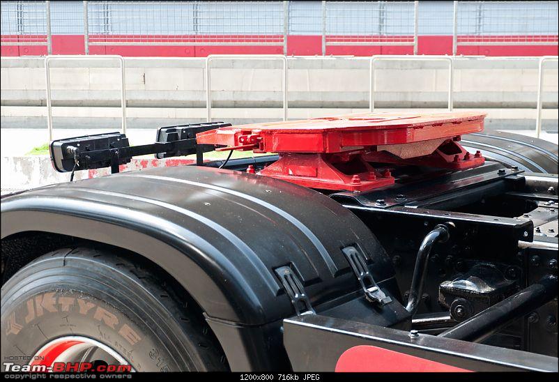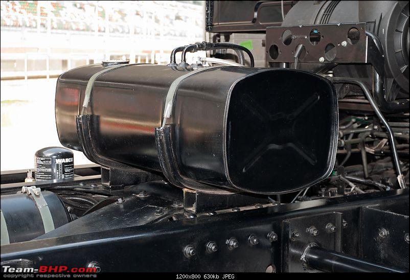 The Prima truck used as race truck is a 4038.S model with massive power output of 370 BHP @ 2100 RPM and a top speed of 110 Km/h. The trucks were modified based on the BTRA guidelines and has been certified by Federation of Motor Sports Clubs of India (FMSCI) after having undergone stringent security check-ups. The 6.5L 6-cylinder engine in the standard form produces 100 bhp less. Tata says that the gain in this power is due to a bigger and much efficient turbocharger that is attached to the engines in the T1 trucks. The Eaton 9-speed manual gearbox remains the same as in production truck.