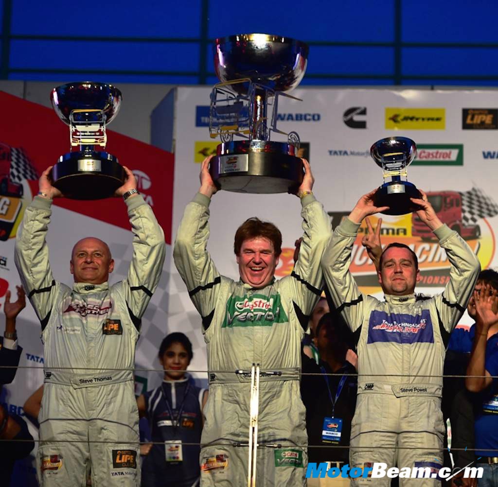 Steve Thomas representing Team Allied Partners grabbed the lead at the end of Qualifiers on 14th March and managed to maintain the same at the end of Super Qualifiers on race day, 15th March, as well. But in the very first turn of the Final Race Stuart Oliver passed him and led until the chequered flag at the end of lap 16. The race was red-flagged when in the second lap Paul McCumisky spun out of control to crash in the concrete barricades at turn one. The trucks were called back to the pits, and complete restart was given. McCumisky and David Jenkins crashed again in the same turn and retired from the race. Till the very end, the fierce competition between Oliver and Thomas continued – they finished in just 0.7 second difference at the checkered flag. Steven Powell came 3rd in 0.6 second.