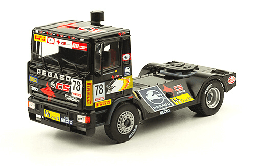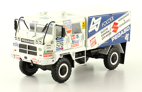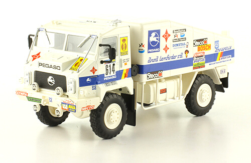 Pegaso trucks collection was issued by Salvat and was distributed in Spain from September 2018 to February 2021. Collection consists of 60 regular issues and 6 extra models available for subscribers. Scale models were produced by IXO and included various types of Pegaso trucks and vans manufactured by Pegaso in 1946 – 2017. Racing theme in collection is supported by Pegaso Troner racing truck of 1989 season, erroneously indicated as 1990 (issue 53), and three Dakar rally vehicles of 1986, 1988 and 1990 (issues 25, 40 and 8, respectively). The promotional price of the first issue was 6.99 euros, issue 2 costs 15.99 Euros, while other regular issues were sold for 24.99 Euros. Pegaso Z-102 (1953) from 24 Horas de Le Mans was among additional models for subscribers (issue R4).