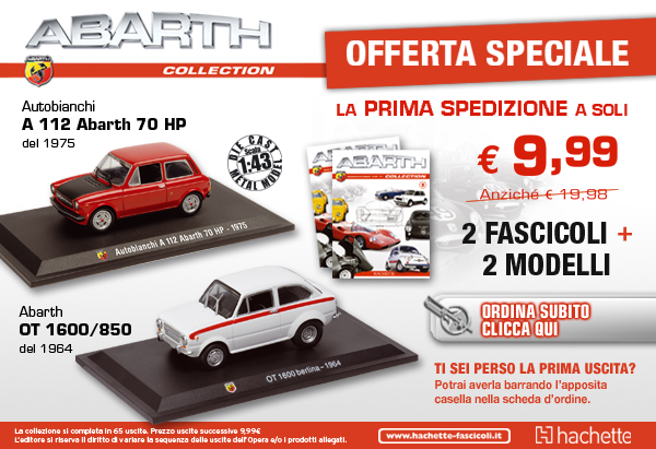 The partwork collection of cars designed by Carlo Abarth was issued in Italy by Hachette publisher in 2008-2010. Models are made by Metro Sales Promotion. At least 66 issues were released. The cost of regular issues was 9.99 Euros, while promotional first issue included two models and booklets for 9.99.