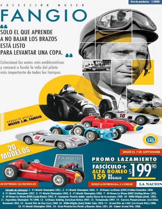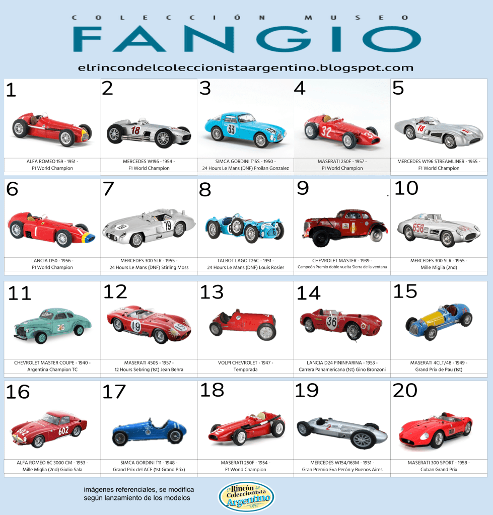 Fangio Museum Collection was a magazine series published by Luppa publishing house and distributed by the newspaper Diario La Nacion in Argentina. Collection consists of 20 issues representing cars from Juan Manuel Fangio Museum at Balcarce, Buenos Aires. Models manufactured by IXO shows the maestro career from 1939 to 1958. The issues were published biweekly from 7 September 2018 till 13 June 2019. Among the models there are several rare open wheels racing cars like Volpi-Chevrolet from 1947 Temporada, Maserati 4CLT/48 from 1949 San Remo Grand Prix or Simca-Gordini T11 from 1948 Grand Prix de l’ACF.