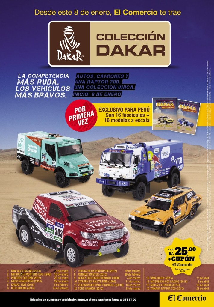 The Dakar Collection by Luppa Solutions SL publishing house was issued and distributed in South American and some Central American countries in 2016 – 2017. Collection consists of 16 issues and was published in two variants. First variant was distributed in Peru by El Comercio publishing house from January to April 2016. Models in 1/43 scale were made by Premium & Collectibles Trading CO Ltd (IXO). Soon after the collection was also distributed in Ecuador, Chile, Colombia, Paraguay, Uruguay, and Costa Rica. In 2017 collection was reissued in Argentina. It was distributed by La Nacion in Argentina between January and May 2017. The price of each issues from one to six was 169.90 Argentinian pesos, issues from 7 to 16 were 199.90 pesos. The selection of models in both issues was slightly different, but both included two models of Dakar trucks – Iveco Powerstar (2014) and KAMAZ-4326 (2015). Both collections were distributed only via kiosks, no subscription was available.