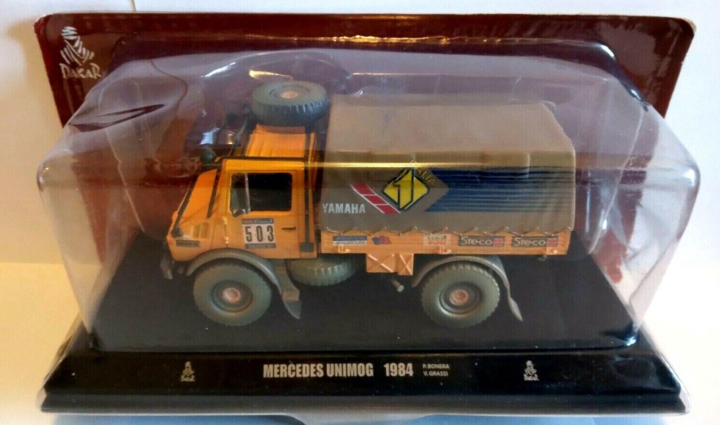 First collection of Dakar cars was issued by de Agostini in 2005. The collection contains 13 issues, 8 models of cars, 4 models of motorcycles and 1 model of truck. The models were produced by Norev, and collection was distributed in France. The only truck in the collection is 1984 Mercedes Unimog.