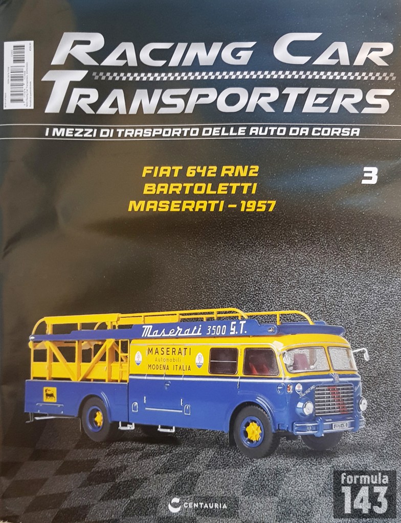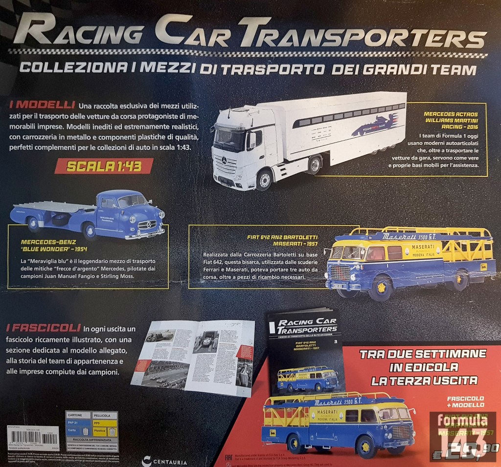 The test version of the Racing Cars Transporters collection was distributed by Centauria in several regions of Italy in spring 2023. The test collection included three models made by IXO with magazines. The price of the first issue was 14.99 Euros, the issues 2 and 3 29.90 Euros.